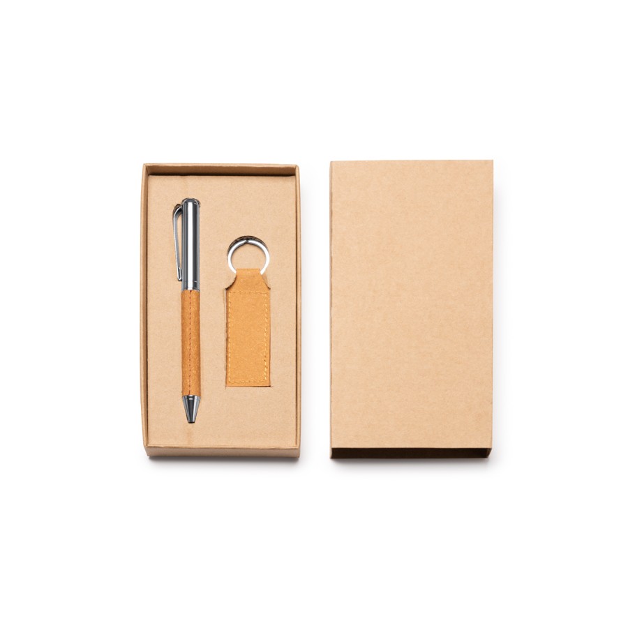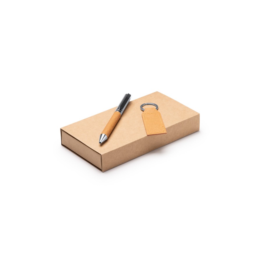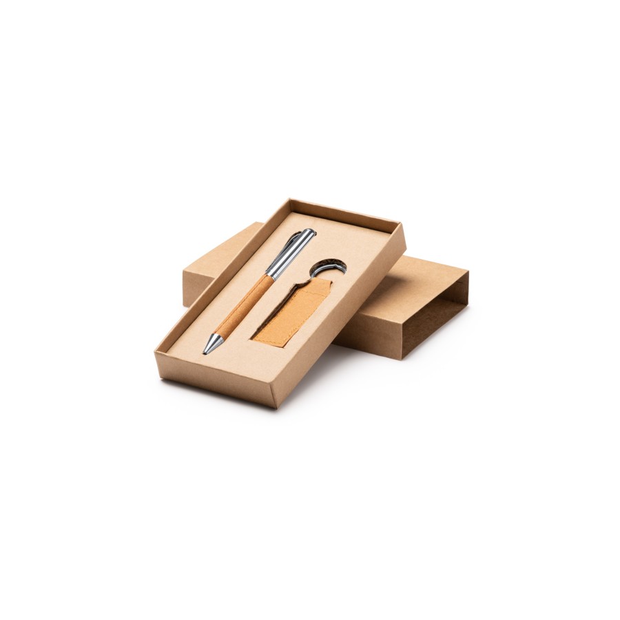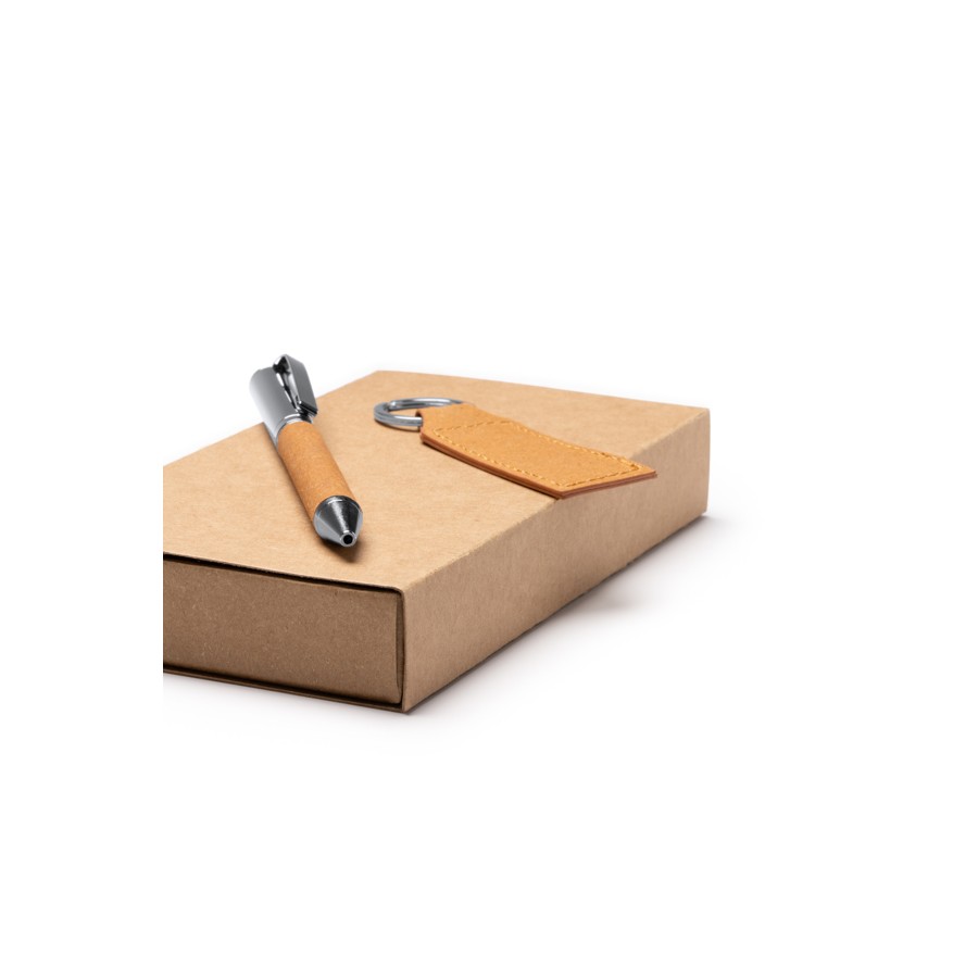 Set de bolígrafo y llavero de piel reciclada con detalles metálicos. Tinta azul. Presentación en estuche eco.