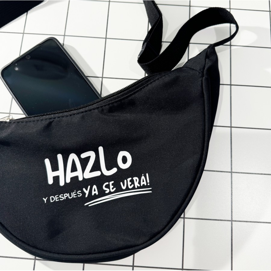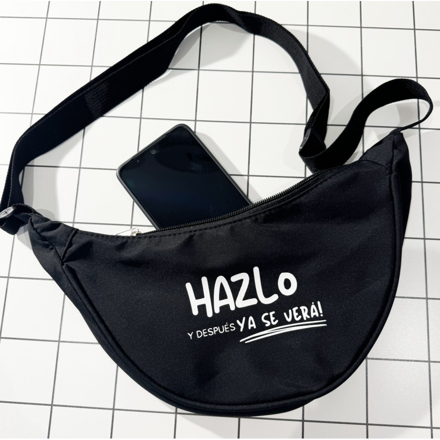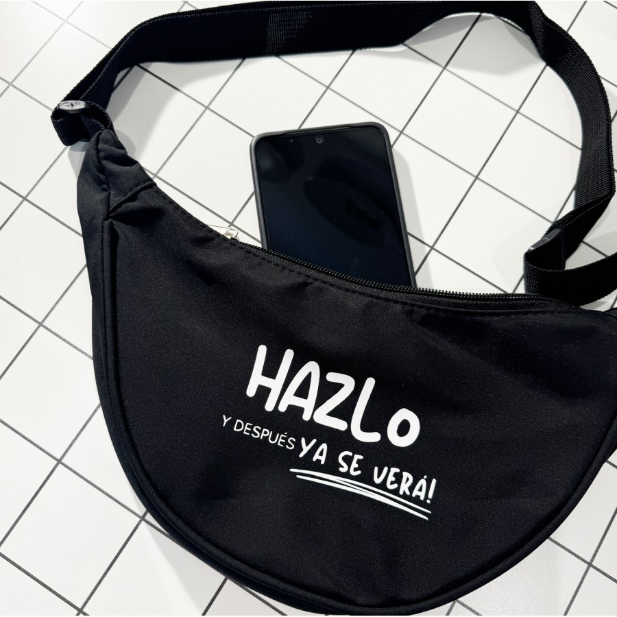 BANDOLERA DE NYLON RECICLADO REPELENTE AL AGUA, ESPACIOSO Y CON MENSAJE POSITIVO.